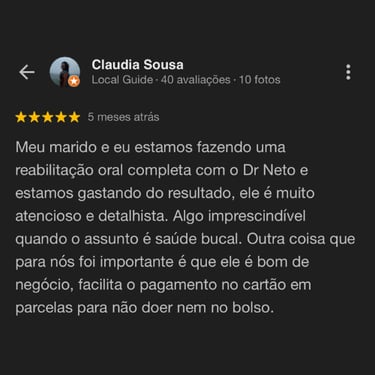 Além disso, o Dr. Neto é proprietário do consultório Rosas Odontologia, onde cada sorriso reabilitado é fruto de uma jornada segura, planejada e baseada nas técnicas mais modernas da Implantodontia. Do primeiro atendimento à colocação do implante, você será tratado com precisão, cuidado e empatia.